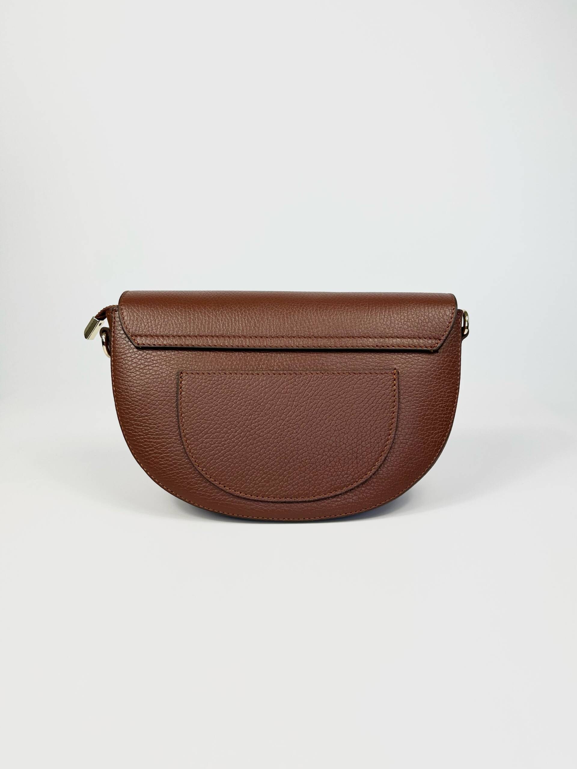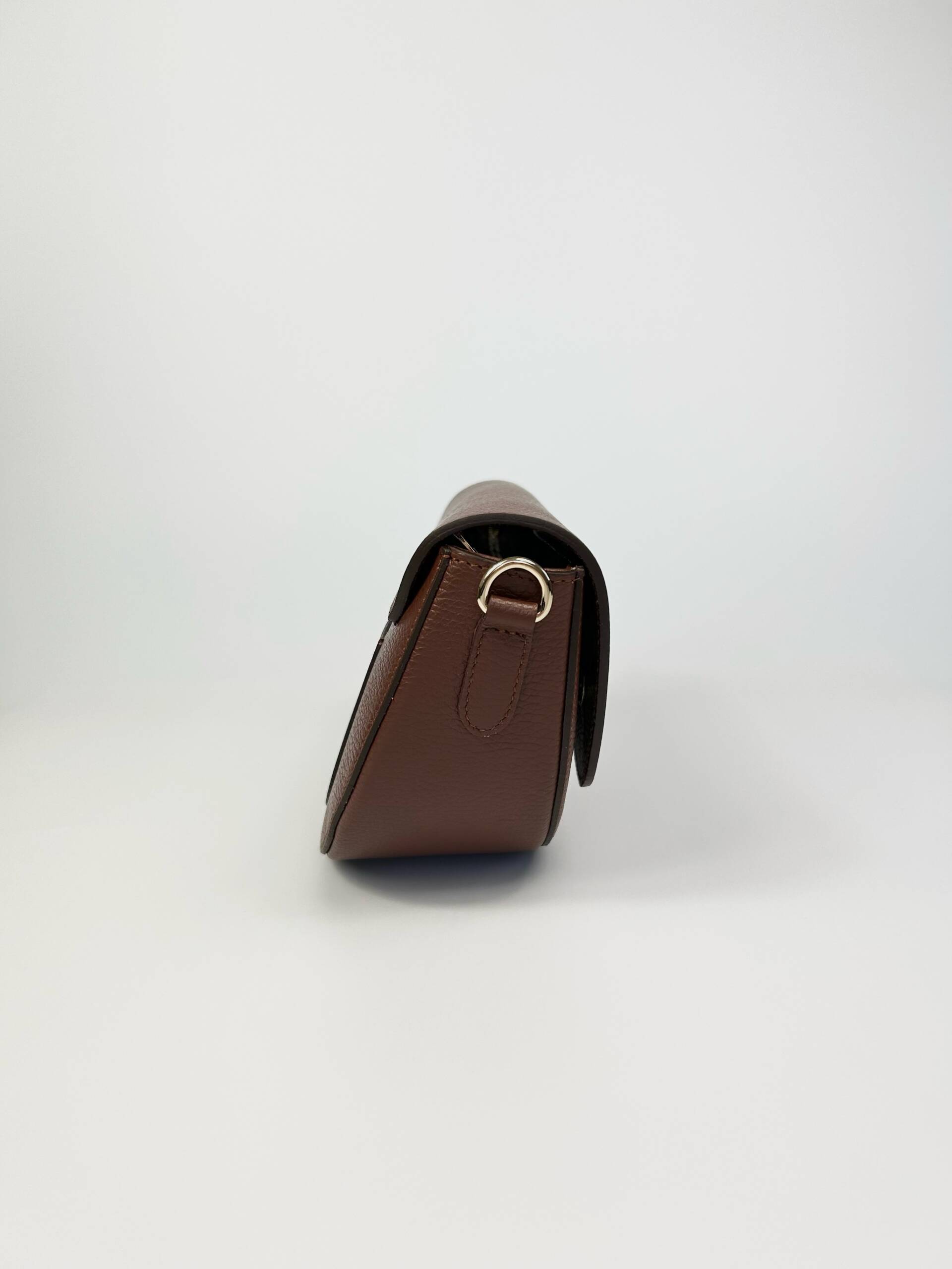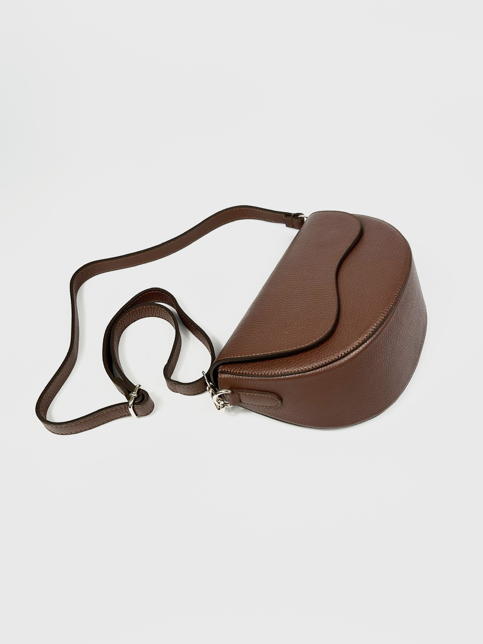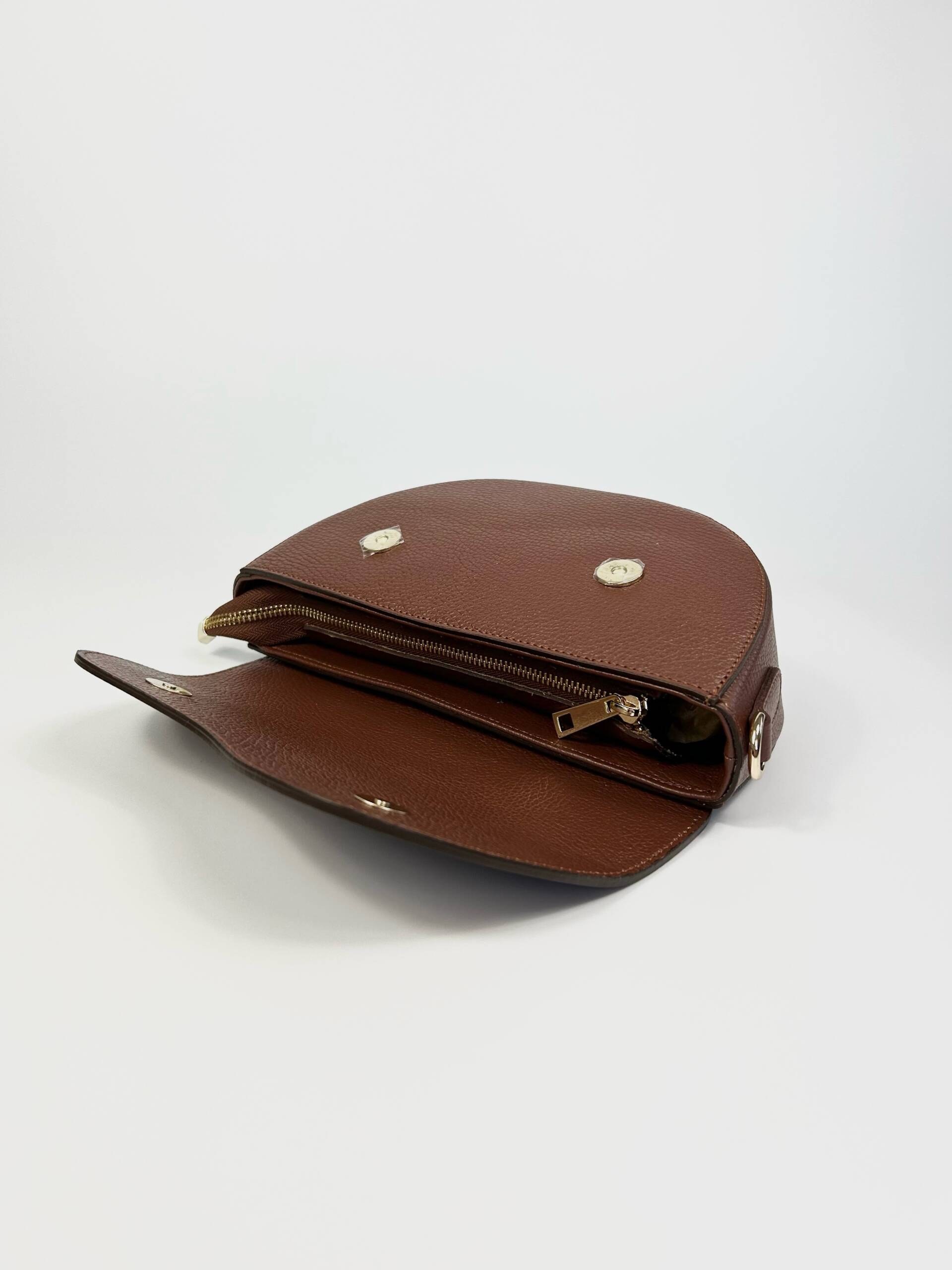Skórzana torebka jednokomorowa, zamykana na dwa zatrzaski magnetyczne.