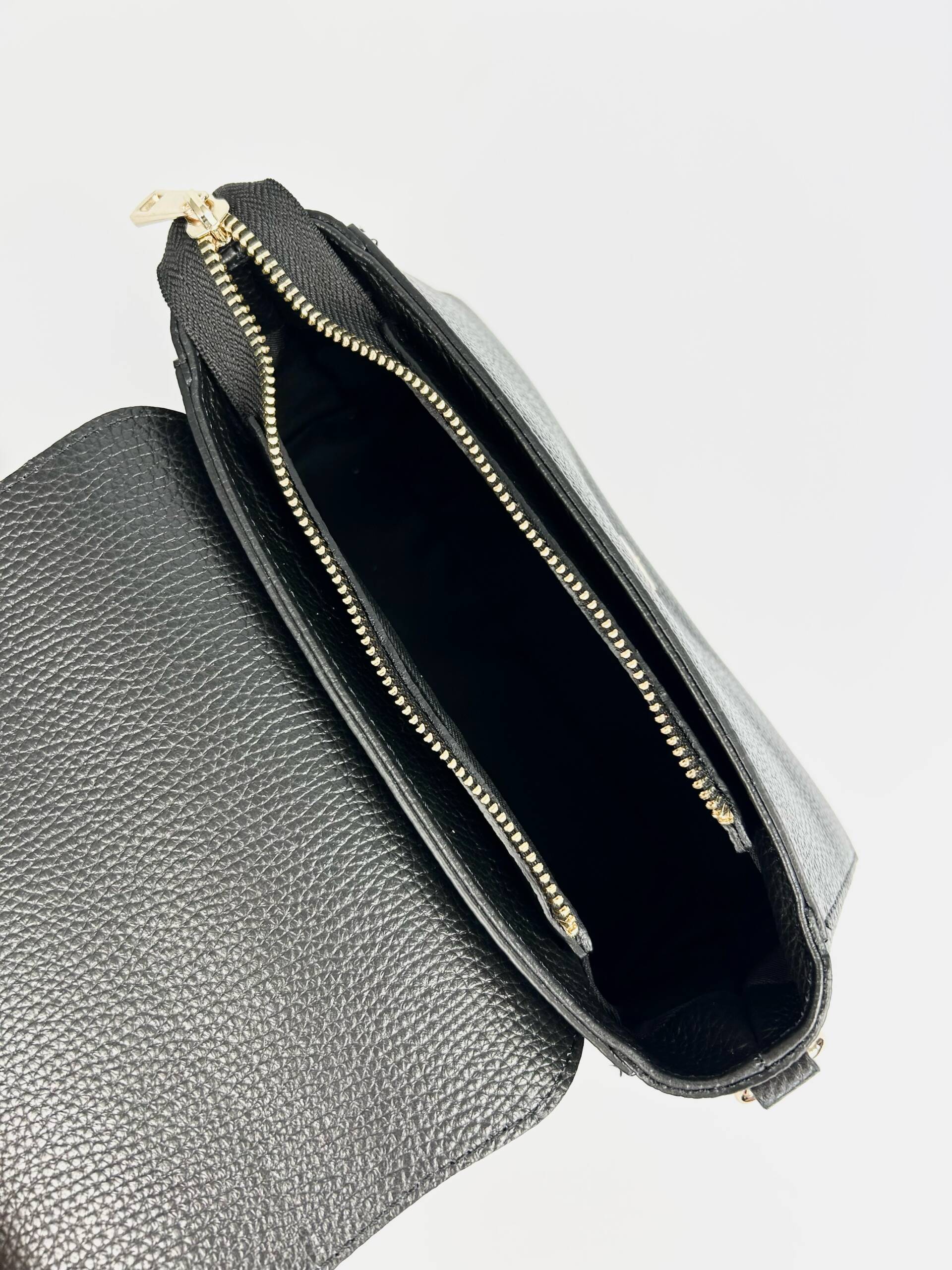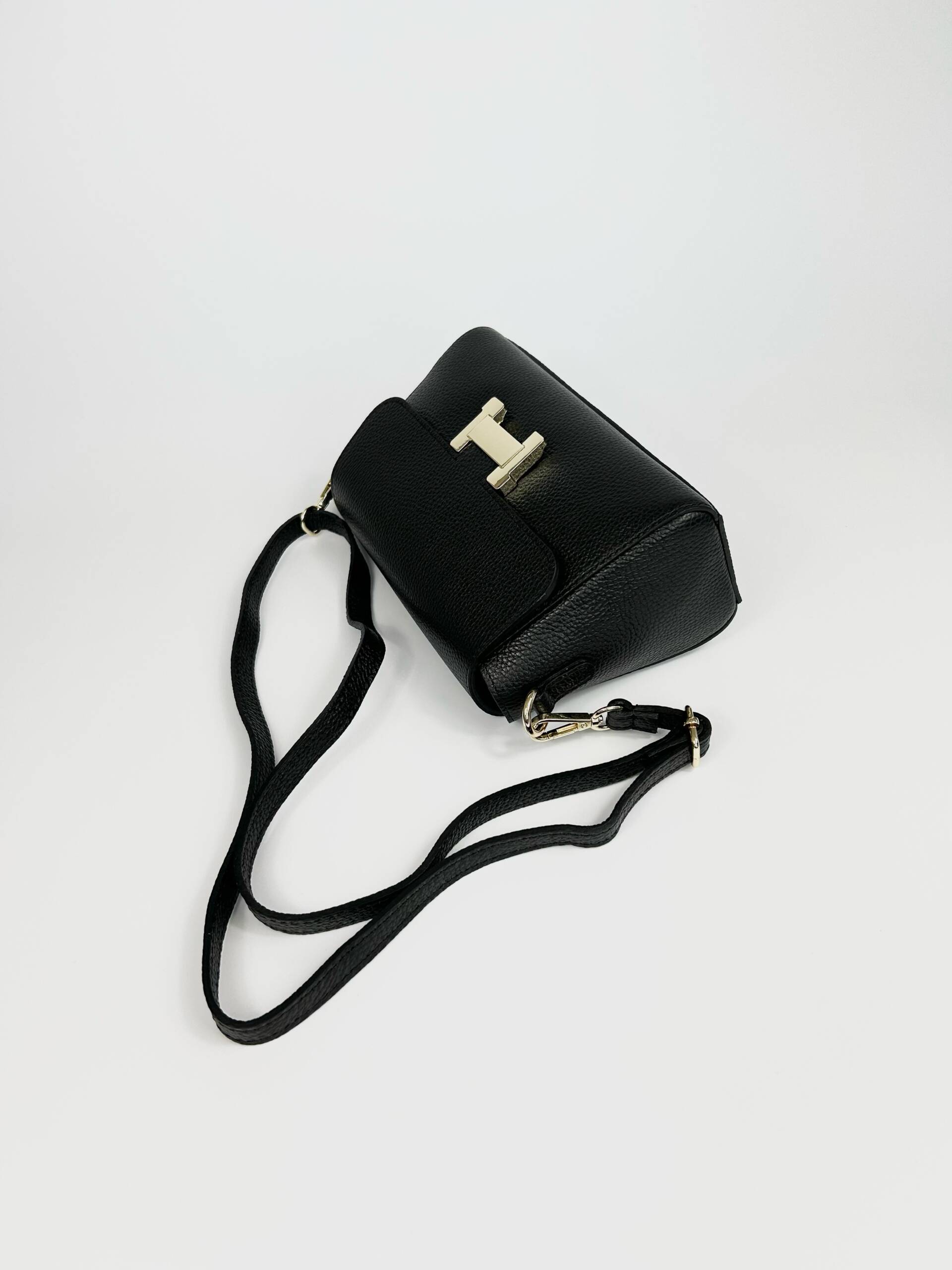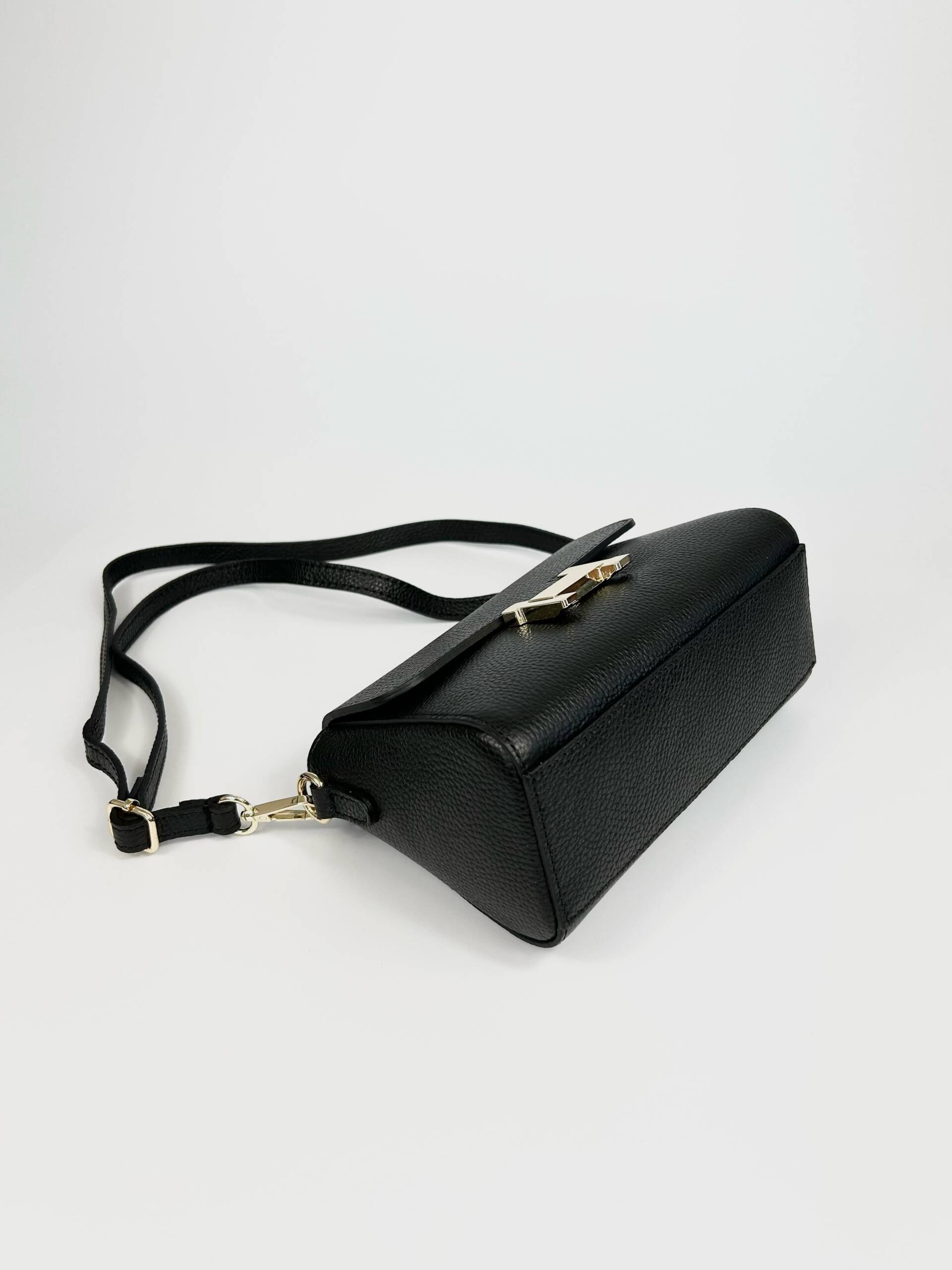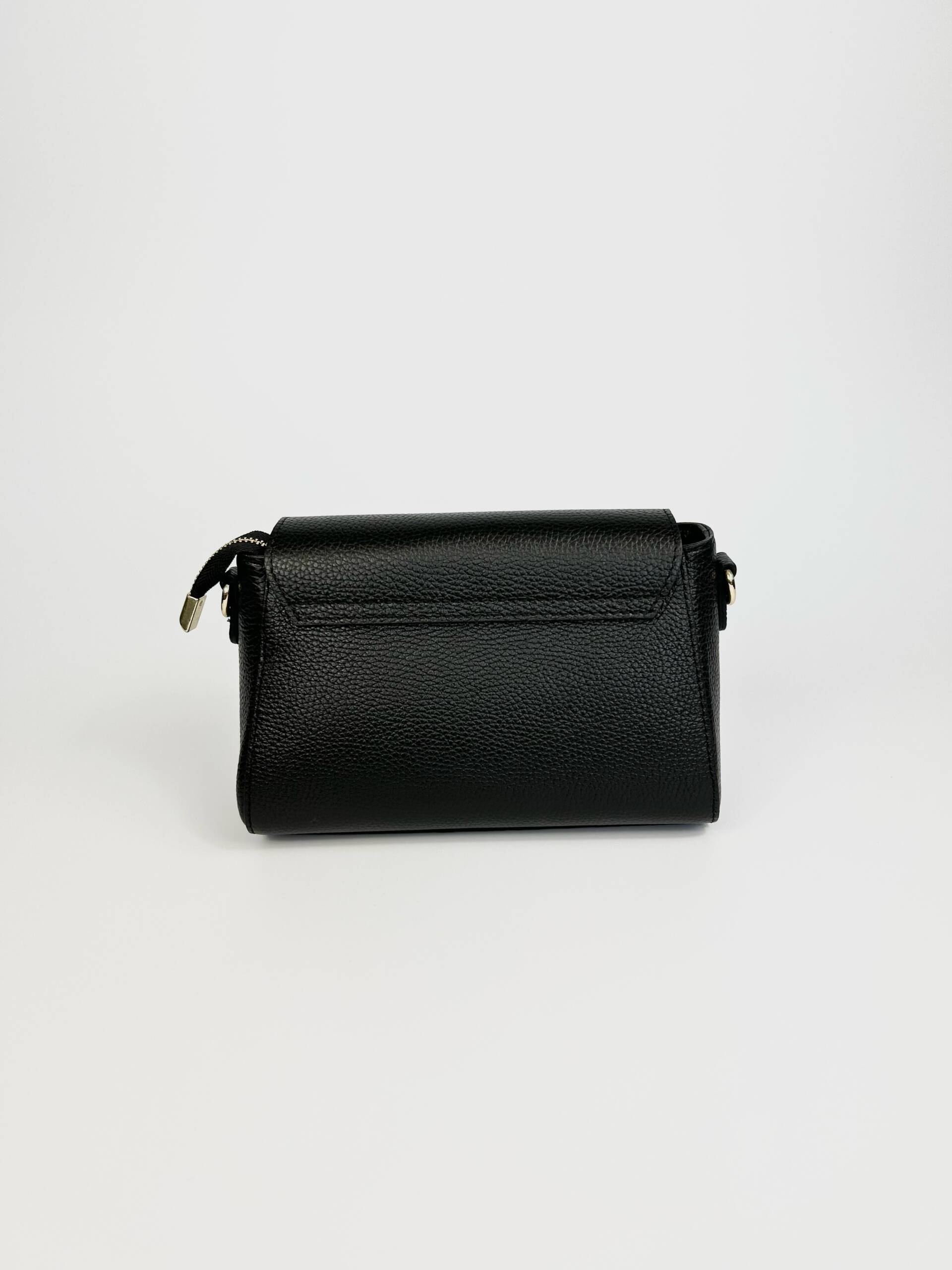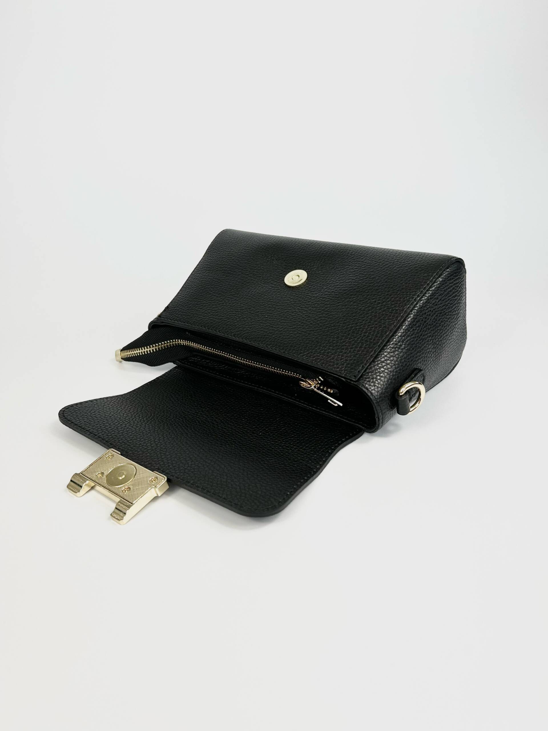 Skórzana torebka z eleganckim zapięciem, zamykana na zatrzask magnetyczny.